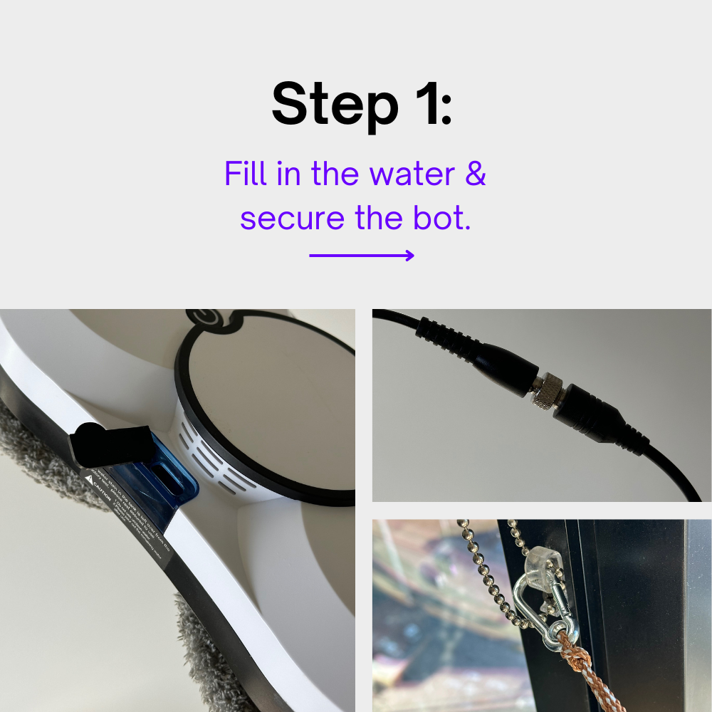 Simply fill the water tank and secure your WindowMate for a seamless cleaning experience. Follow these simple steps to set up and let the bot do the work for you!